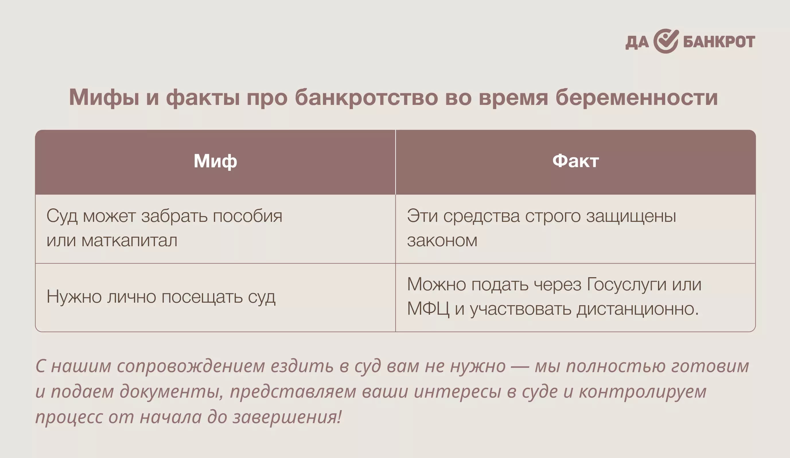 Банкротство — сложная юридическая процедура, и проходить её самостоятельно, особенно во время беременности, рискованно. Лучше действовать с поддержкой специалистов: мы помогаем собрать все документы, подготовить заявление, представлять ваши интересы в суде и обеспечить максимально безопасное для вас и вашей семьи прохождение процедуры. Помните: своевременное обращение к юристу и правильная защита имущества при банкротстве помогут вам сохранить спокойствие, здоровье и уверенность в будущем.