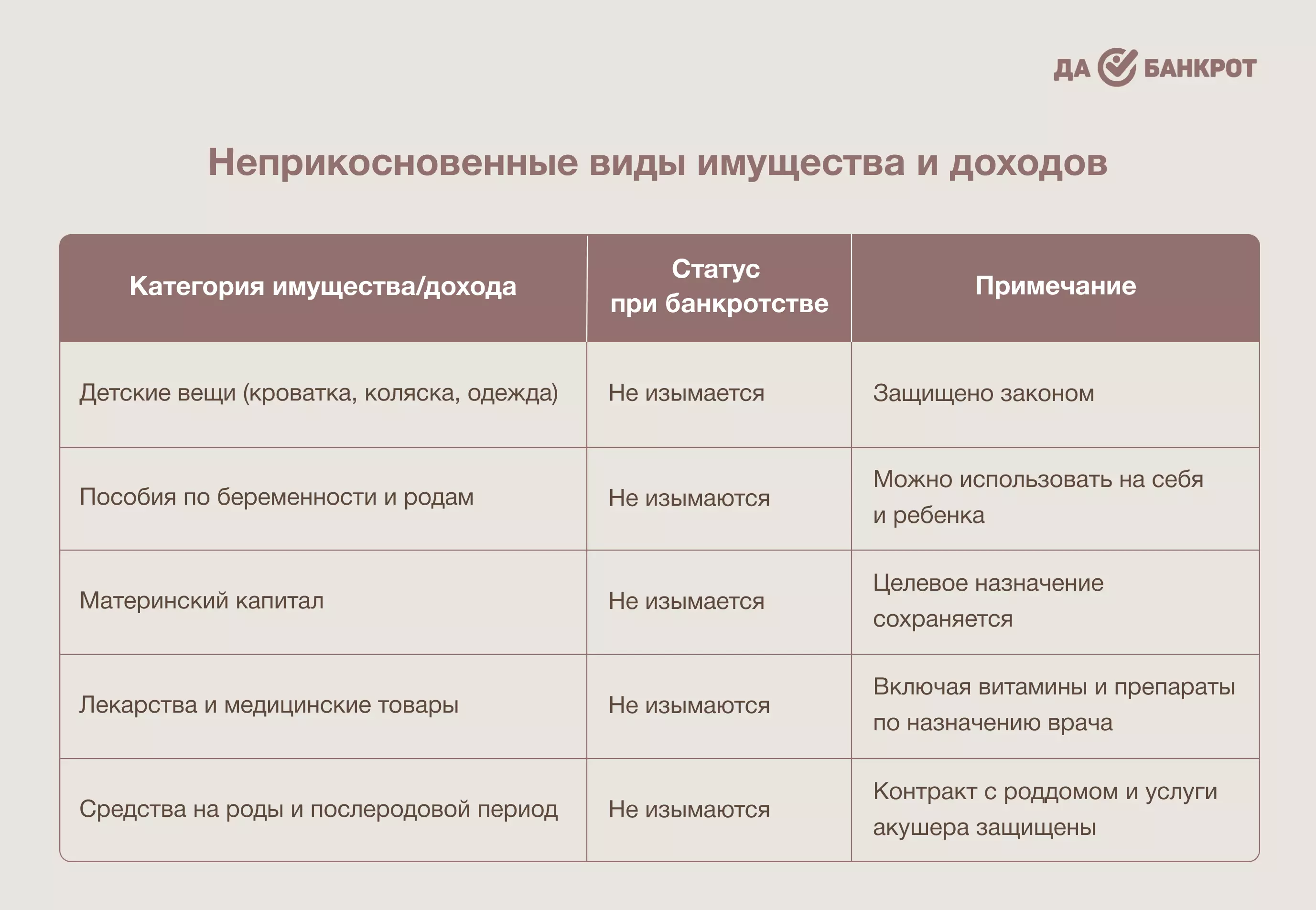 Всё, что предназначено для ребенка — коляска, кроватка, одежда, предметы ухода, игрушки, мебель, — не подлежит взысканию. Даже если кредиторы будут настаивать на продаже, суд исключит эти вещи из конкурсной массы.