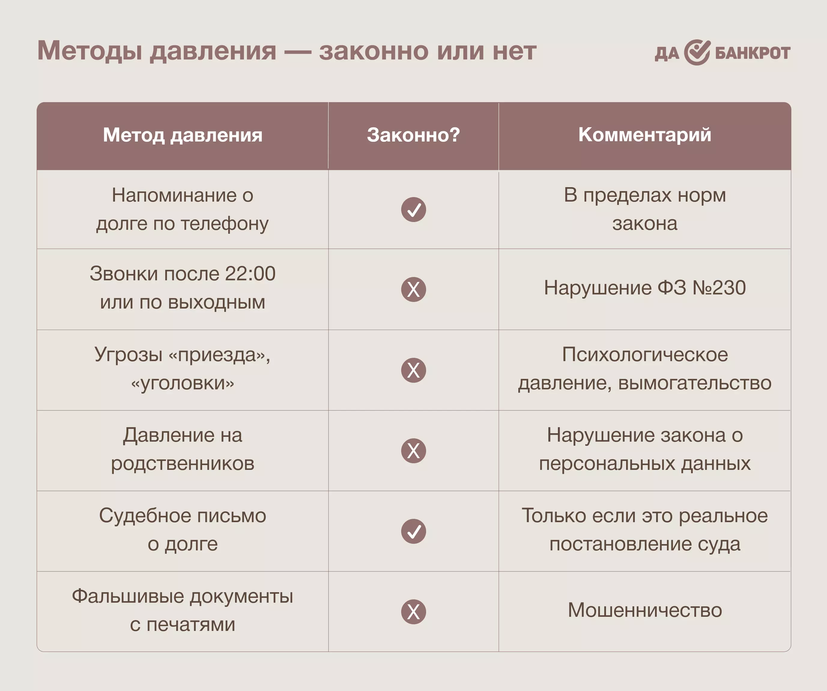 Коллекторы не имеют права вымогать деньги у ваших родственников, особенно если они не являются поручителями или созаёмщиками. Также под запретом любые формы давления: угрозы, оскорбления, манипуляции.