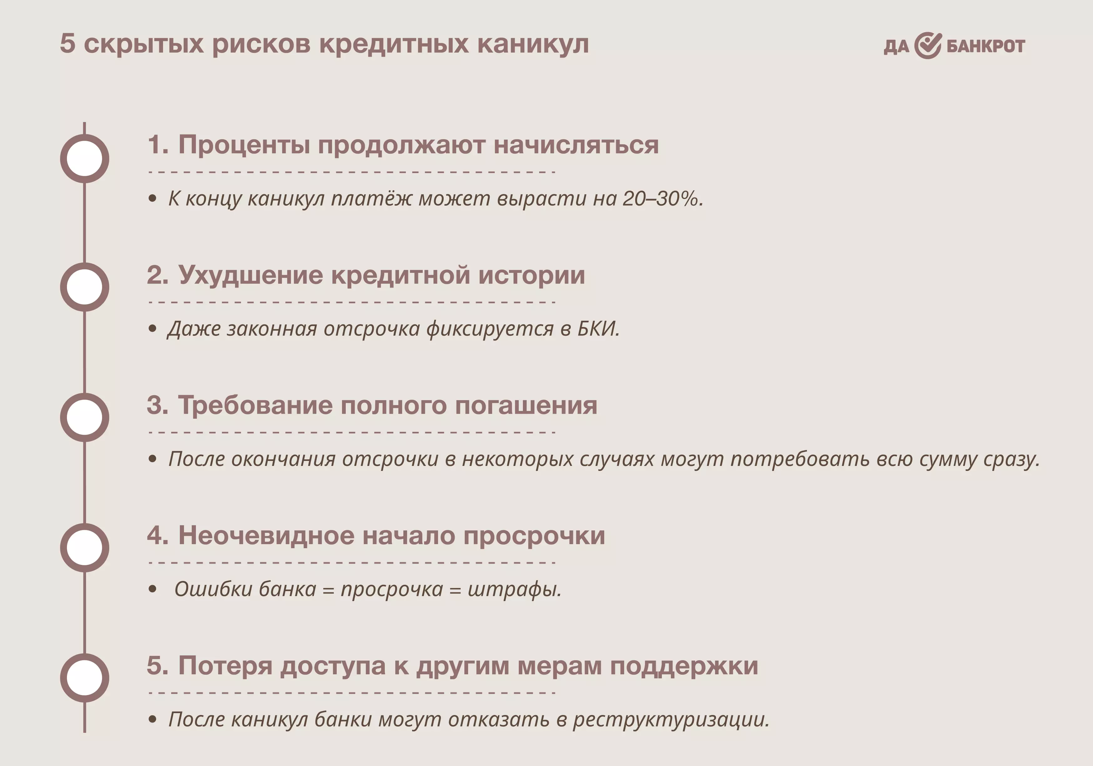 Банк может не остановить начисление процентов, даже если вы временно не платите основной долг. И хотя вы не получаете уведомлений о просрочке, сумма кредита продолжает расти. К концу «льготного периода» вы можете обнаружить, что платить нужно больше, чем до начала каникул. Это особенно опасно при высоких ставках — даже 3–6 месяцев отсрочки приводят к росту общей переплаты на десятки тысяч рублей.