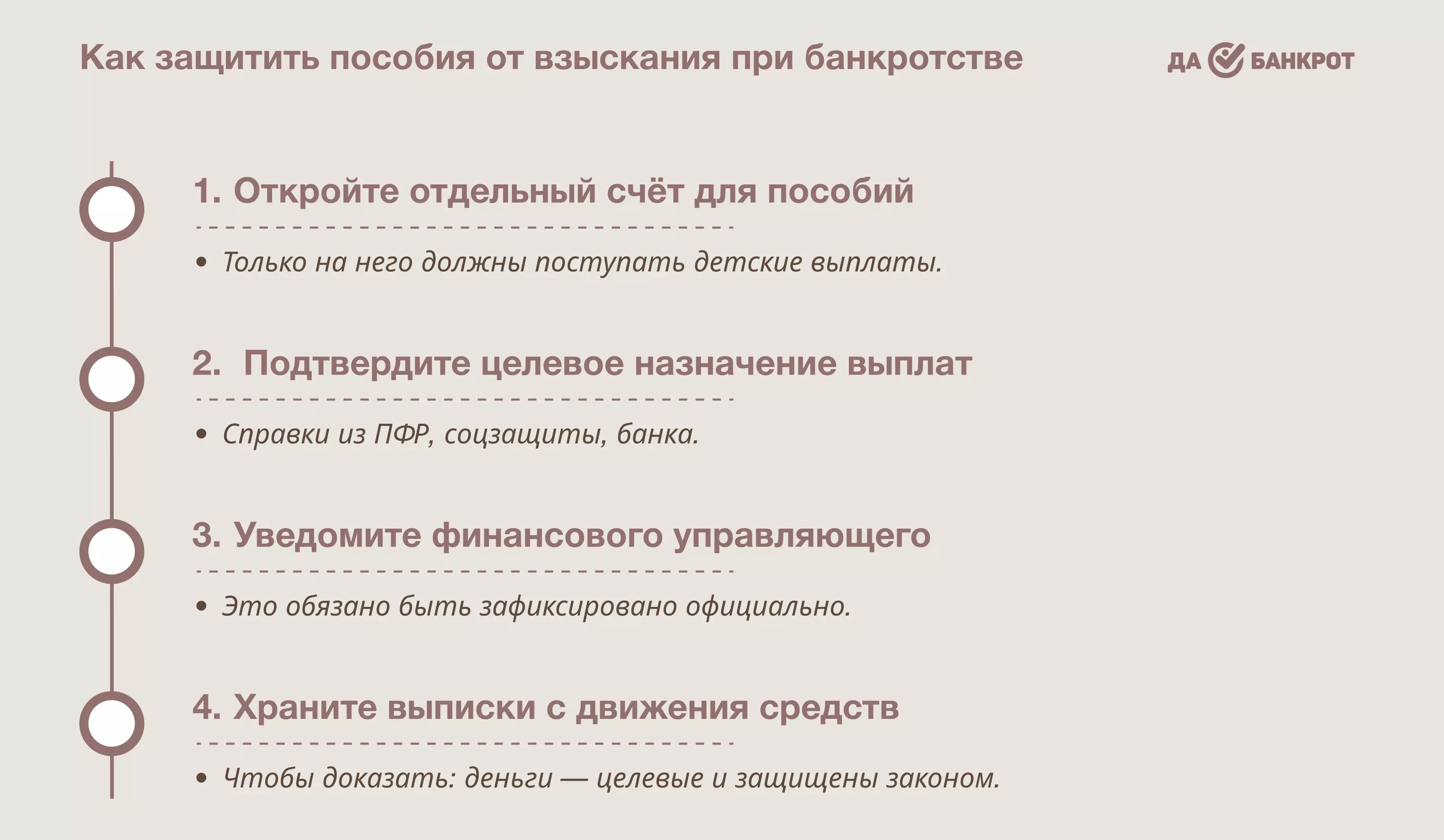 Назначьте отдельный счёт, куда поступают пособия, и уведомите об этом финансового управляющего. По закону эти выплаты не подлежат взысканию, но их нужно своевременно «отделить» от общего потока средств.