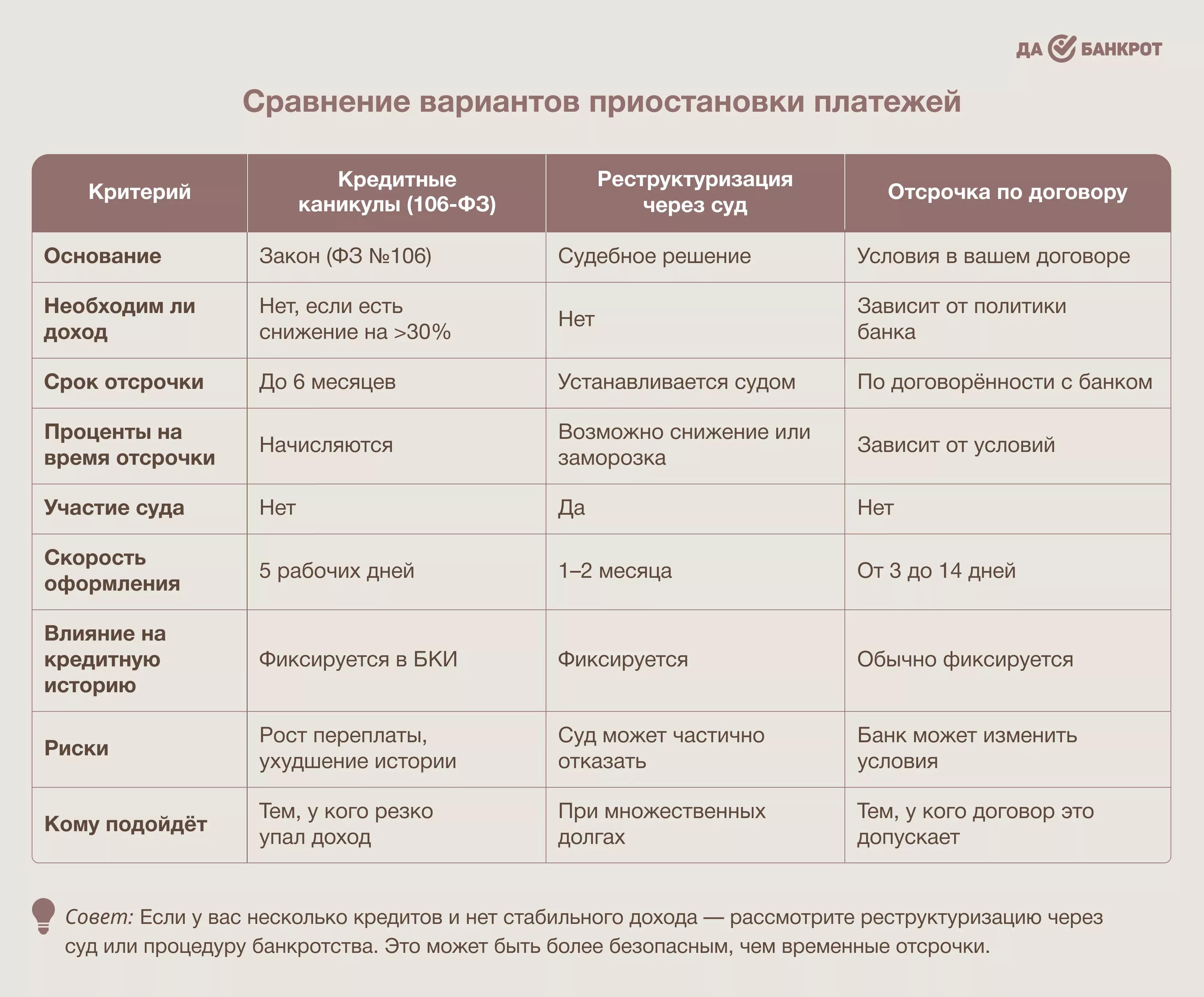 Обратившись за отсрочкой, вы можете потерять возможность подать заявление на реструктуризацию долга или воспользоваться программой поддержки от государства. Банки часто считают, что одна форма помощи уже была использована, и отказывают в других. Это ограничивает гибкость ваших дальнейших шагов.