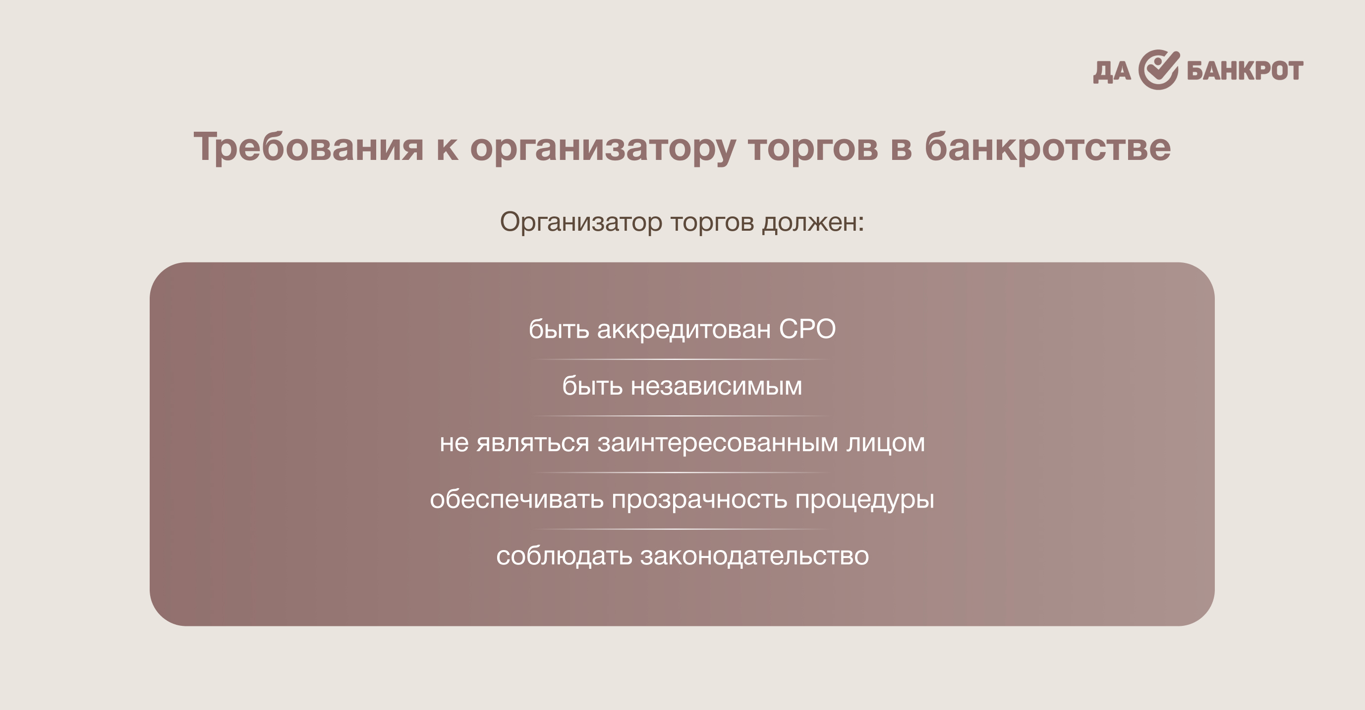 Финансовый управляющий сослался на абз. 6 п. 1 ст. 20.3 Закона о банкротстве: организатор торгов и оператор электронной площадки должны быть аккредитованы СРО и не могут быть заинтересованными лицами. Именно на этом основании было подано заявление о разногласиях — чтобы суд определил, кто действительно имеет право принимать решение о выборе организатора торгов.