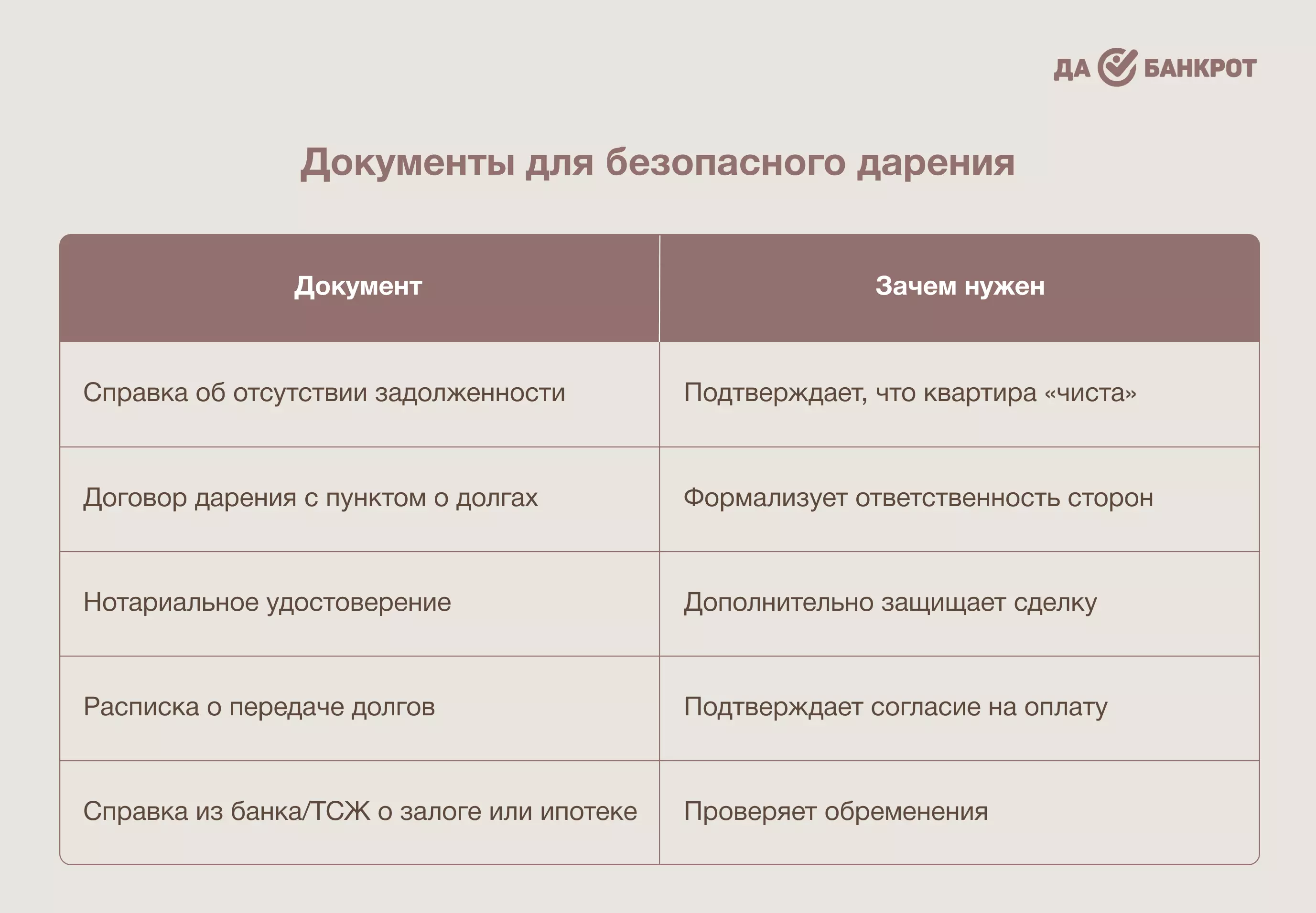 Самый безопасный способ — полностью закрыть долги заранее. Тогда квартира переходит к одаряемому без финансовых обременений.