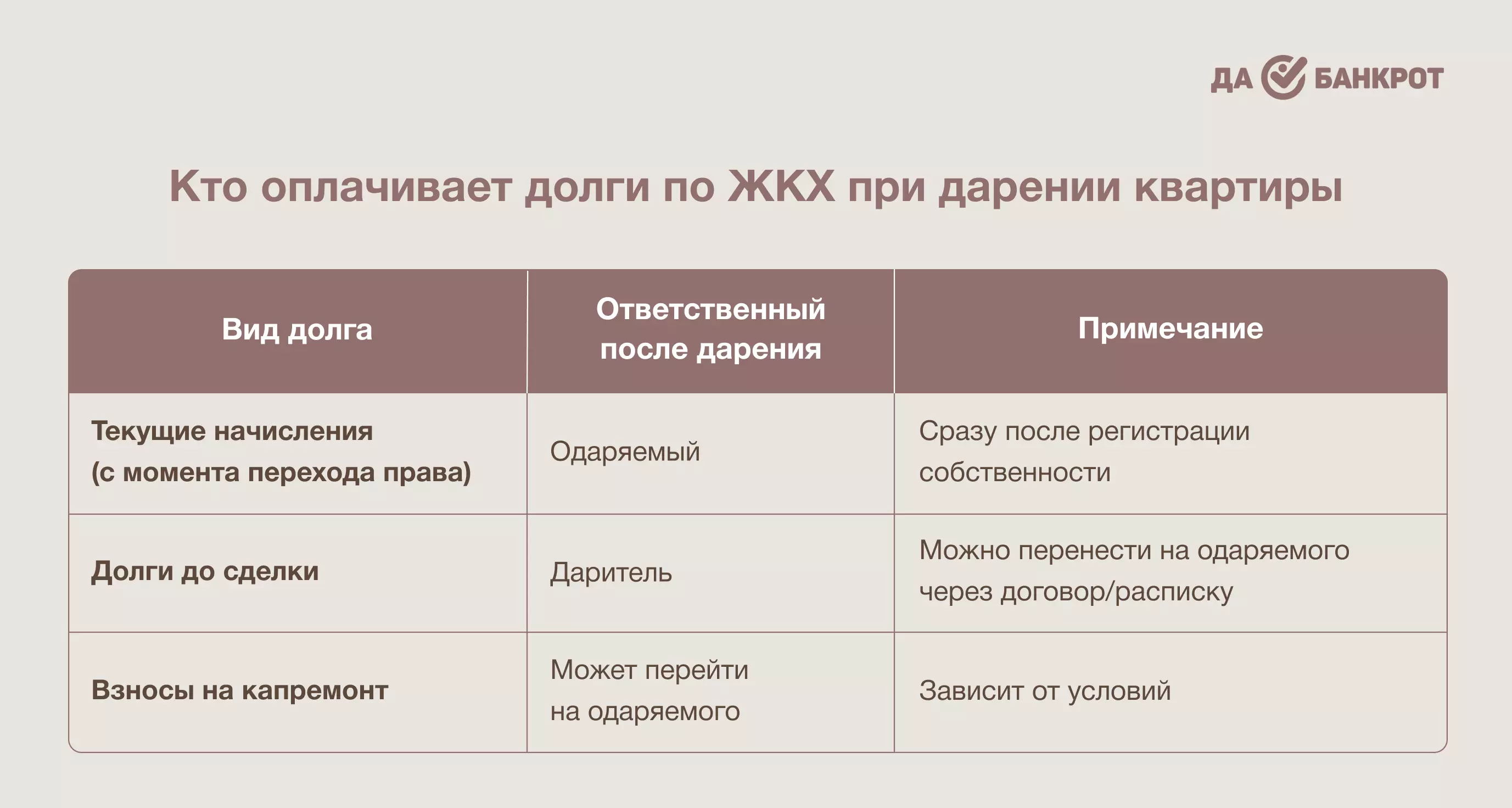 Если квартира передается с долгами, важно понимать, какие обязательства переходят. По общему правилу старые долги за ЖКХ или кредиты не переходят на нового владельца, поэтому получатель подарка не будет обязан их оплачивать. Исключение составляют случаи, когда квартира находится в залоге или ипотеке — тогда долг «привязан» к недвижимости и должен быть погашен в соответствии с договором.