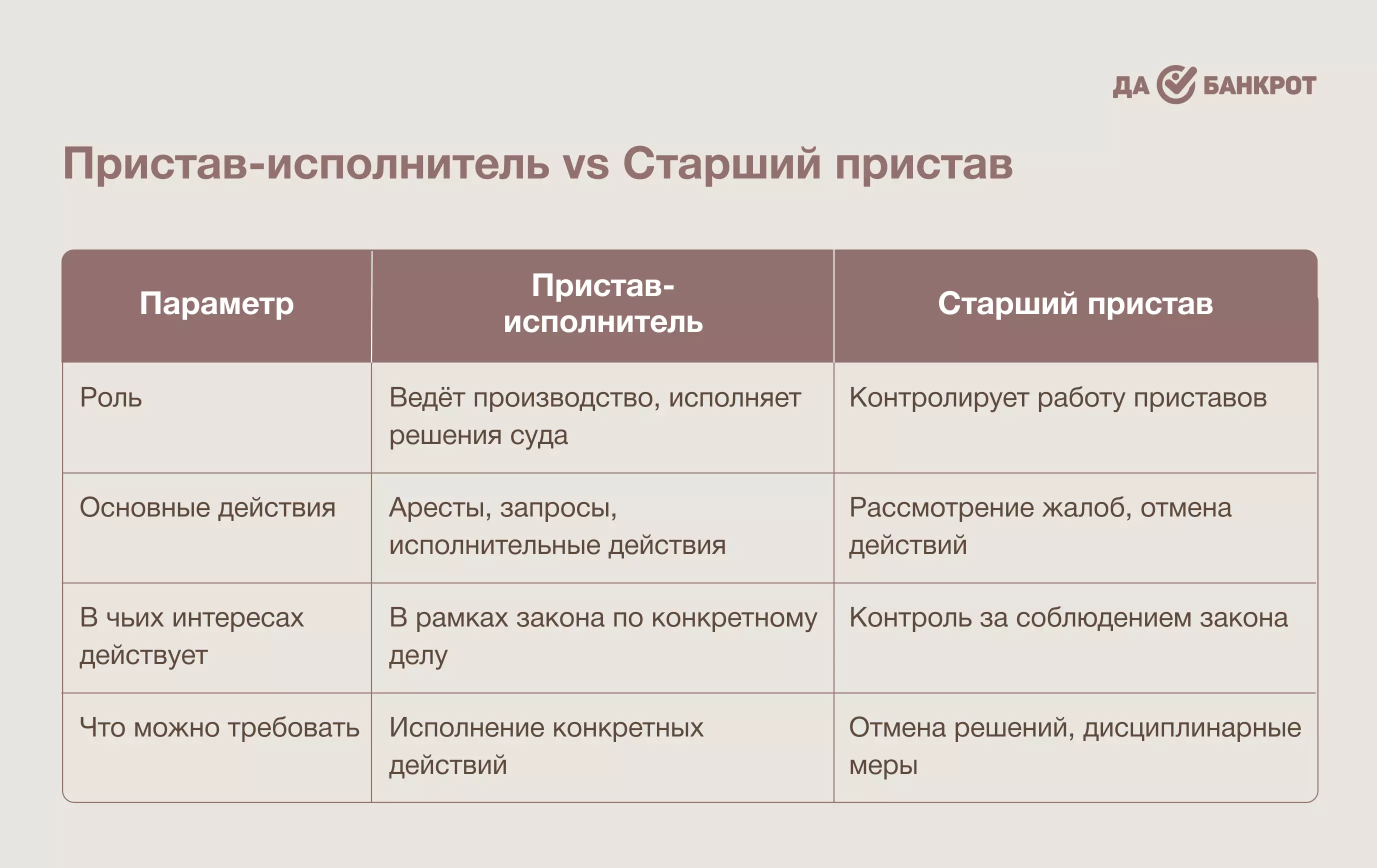 Если пристав-исполнитель занимается практическим ведением дела — возбуждает производство, направляет запросы, описывает имущество и т.д., — то старший пристав выступает в роли внутреннего контролёра. Он имеет право отменять незаконные постановления, проверять, насколько своевременно и полно исполняются решения суда, а также инициировать дисциплинарные меры в отношении подчинённых. Фактически, это должностное лицо — ваш главный адресат, если речь идёт о жалобах в рамках исполнительного производства при банкротстве.