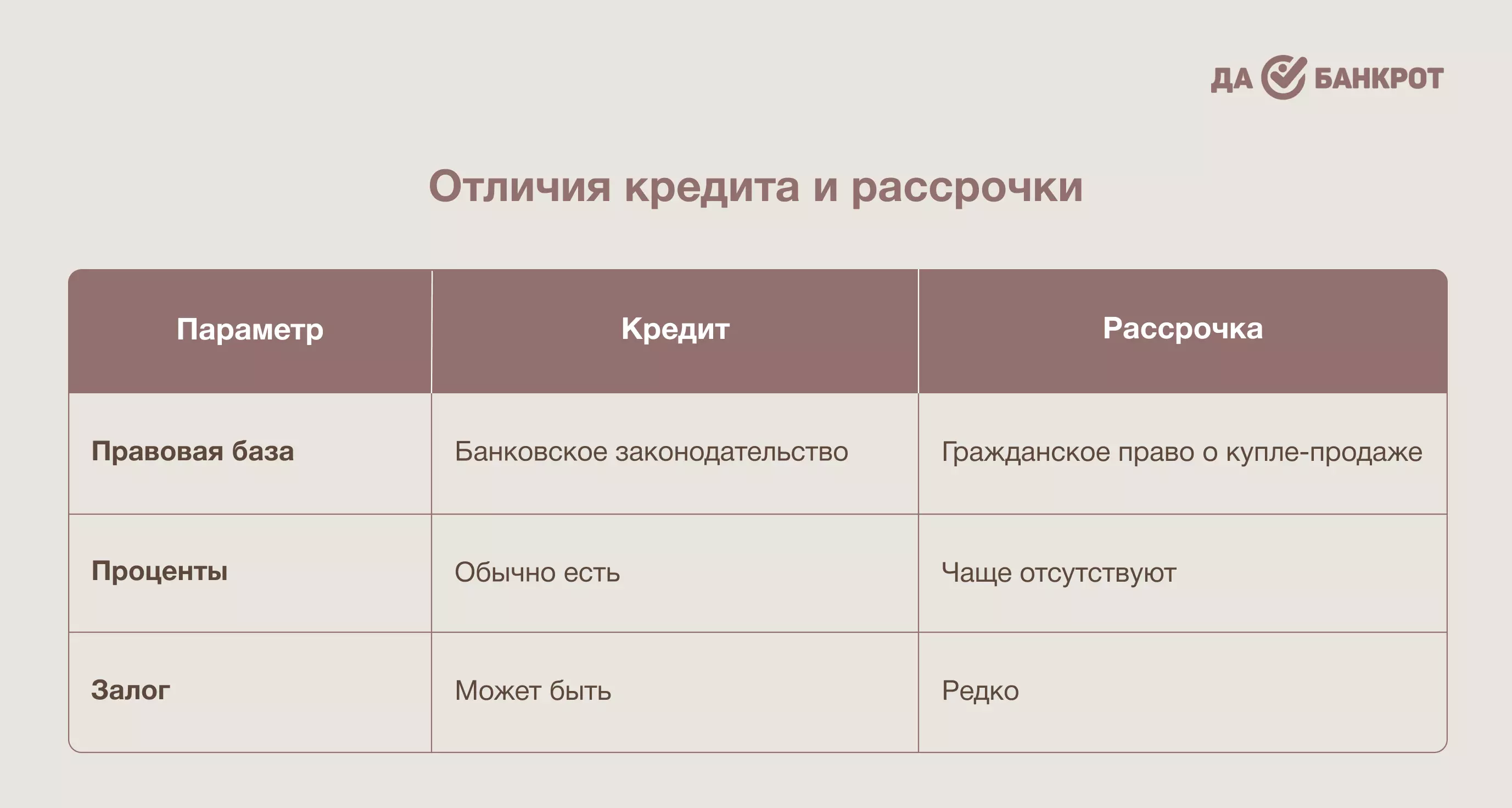 Вы должны знать, что кредит и рассрочка — это разные правовые конструкции. Второе регулируется гражданским законодательством о купле-продаже и не предполагает обязательной выплаты процентов за пользование средствами.
