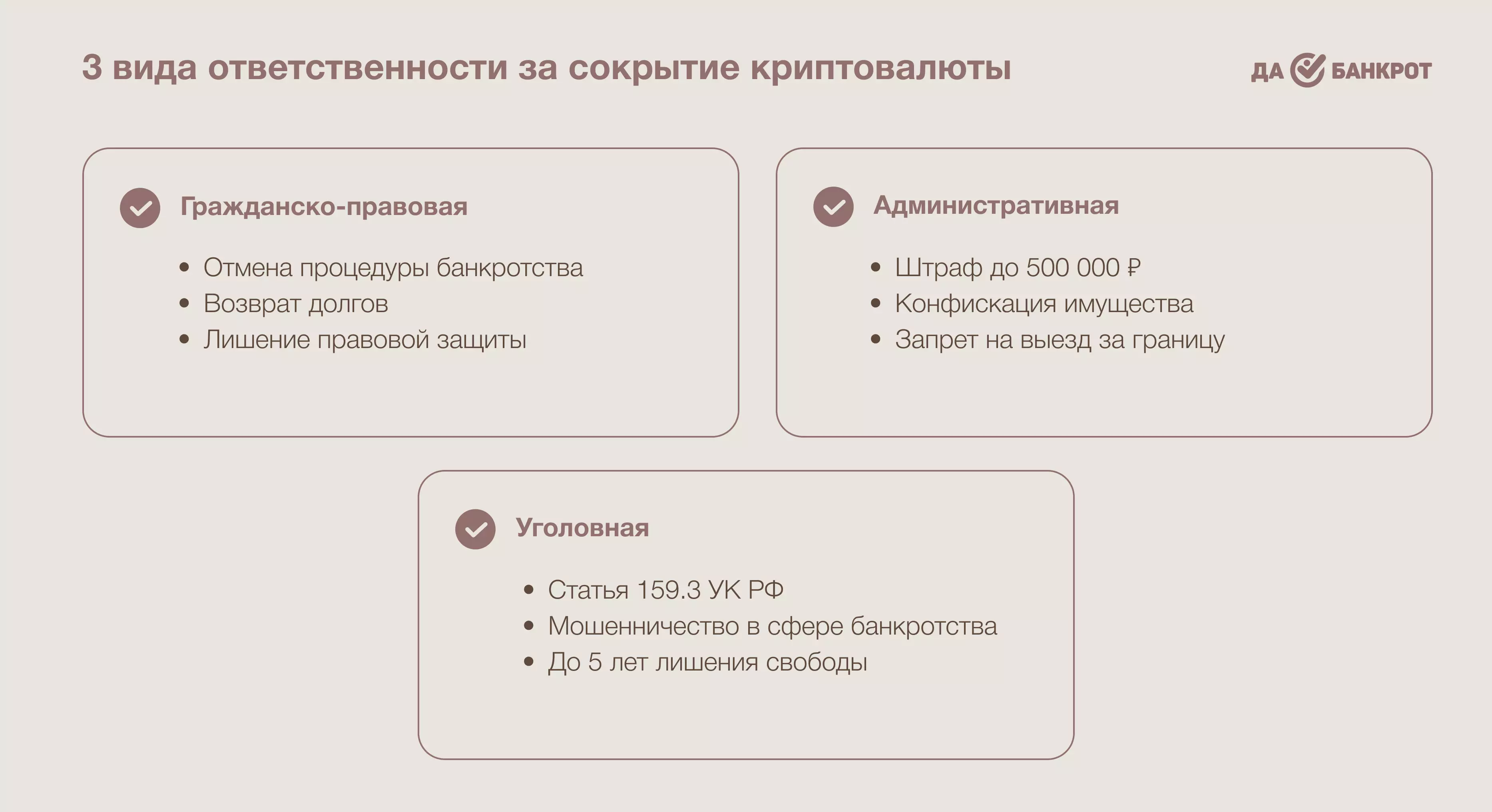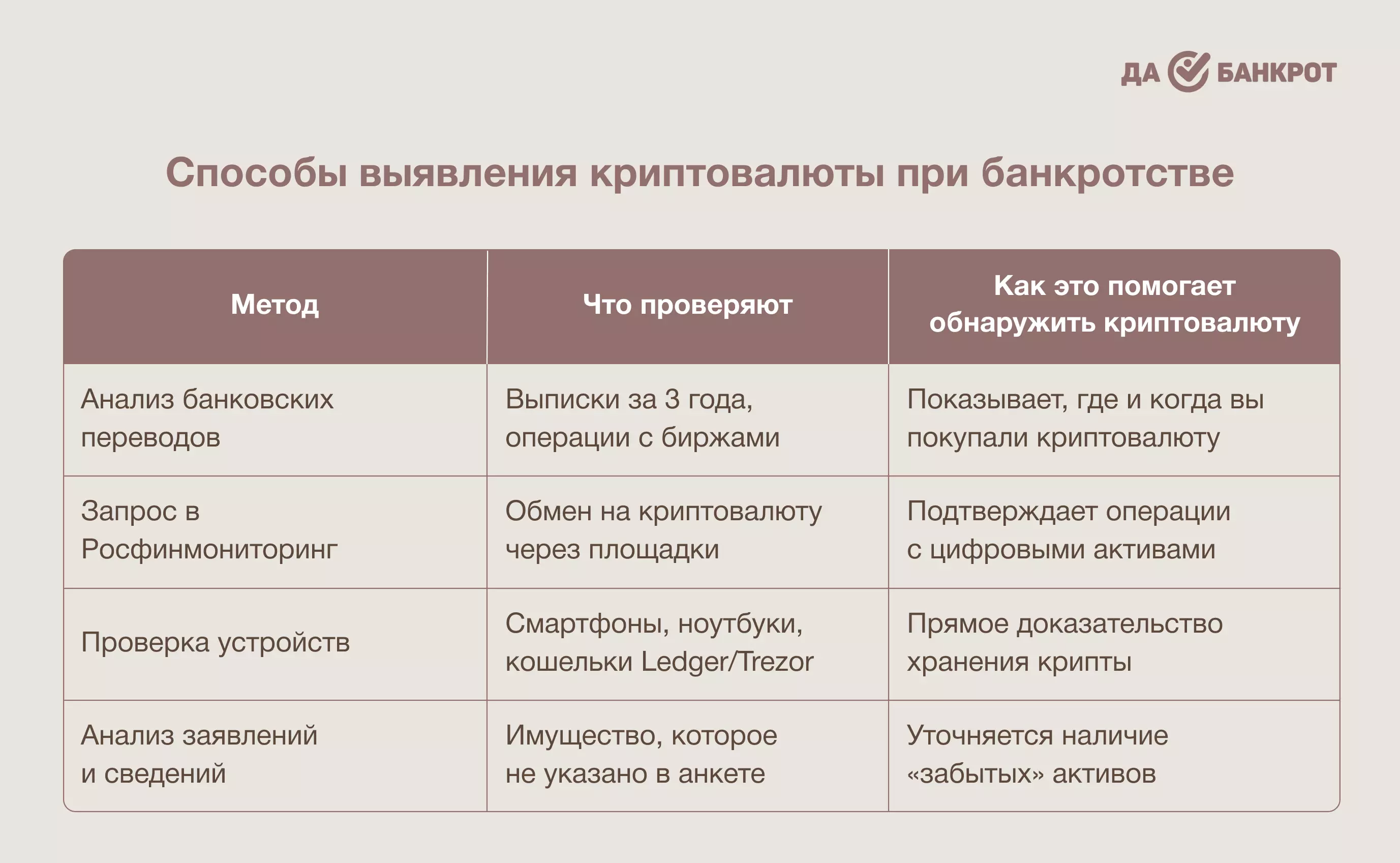 Движение средств между банковскими счетами и криптобиржами фиксируется, даже если оно происходило до признания вас банкротом. Транзакции на сумму свыше 600 000 рублей автоматически попадают в зону внимания по 115-ФЗ (о противодействии легализации (отмыванию) доходов). Управляющий анализирует выписки за 3 года, запрашивает документы у банков и делает вывод о наличии криптовалюты.