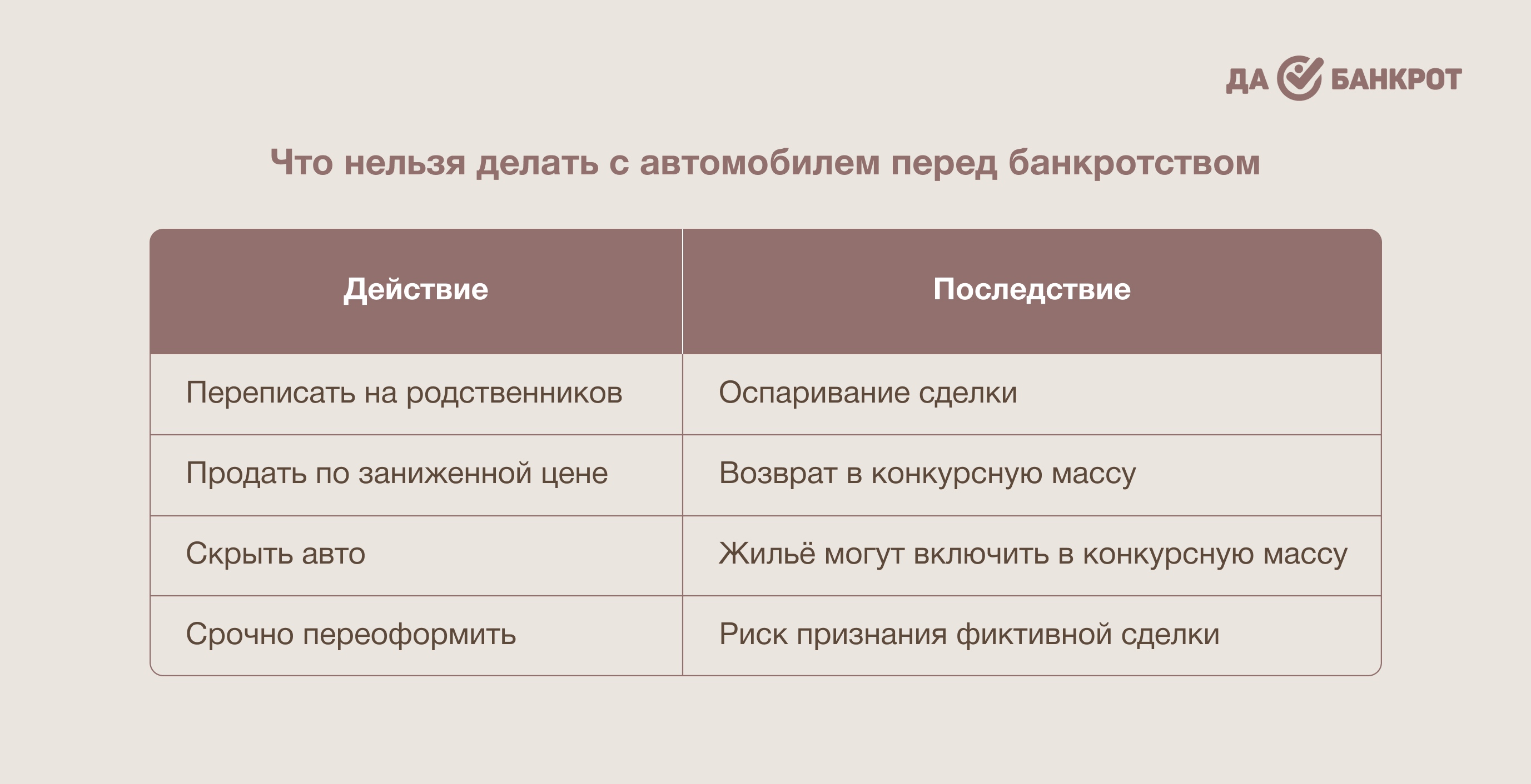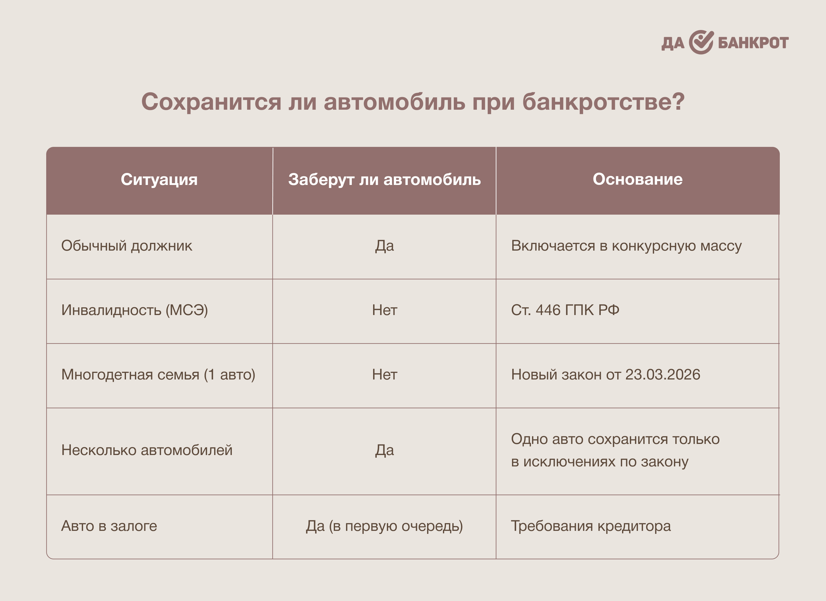 Процедура банкротства часто вызывает множество вопросов: что остаётся у вас, а что обязательно пойдет на погашение долгов? Один из самых частых мифов — возможность сохранить автомобиль. По умолчанию любые транспортные средства включаются в конкурсную массу, и только узкий круг исключений позволяет оставить машину у себя.
