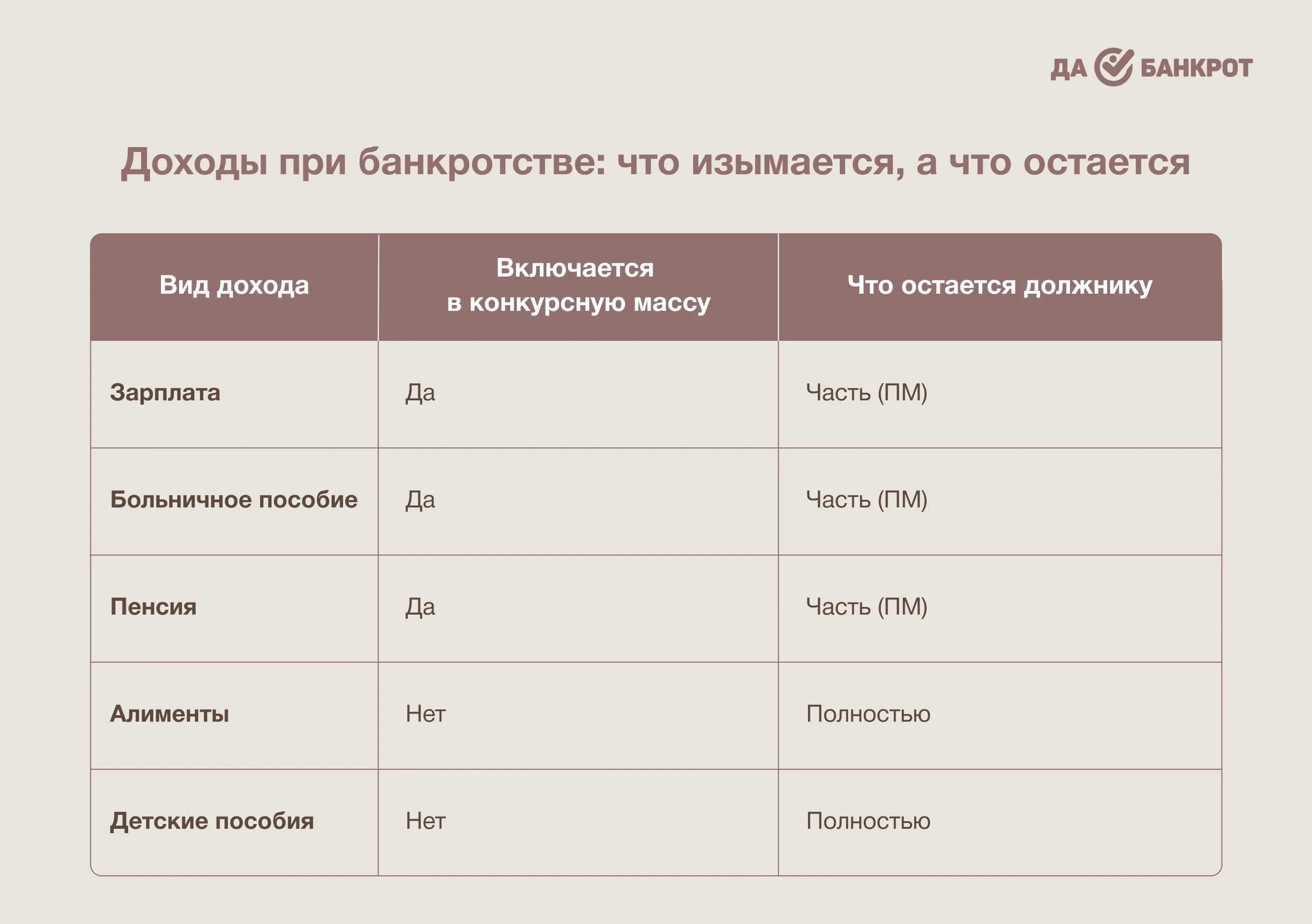 Закон устанавливает гарантированную сумму, которая остаётся у вас в ходе процедуры банкротства: на этапе реструктуризации — фиксированная сумма (50 000 рублей), а на этапе реализации имущества — прожиточный минимум. Больничное пособие учитывается при расчёте этих сумм, при этом доход сверх установленного размера направляется в конкурсную массу.