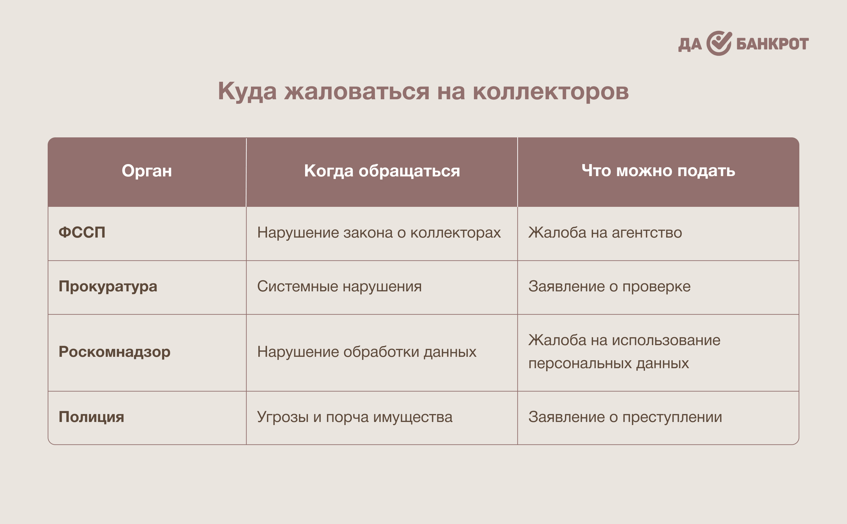 Основной контролирующий орган — Федеральная служба судебных приставов. Также можно обратиться в прокуратуру, полицию или Роскомнадзор, если речь идет о незаконной обработке персональных данных или угрозах.